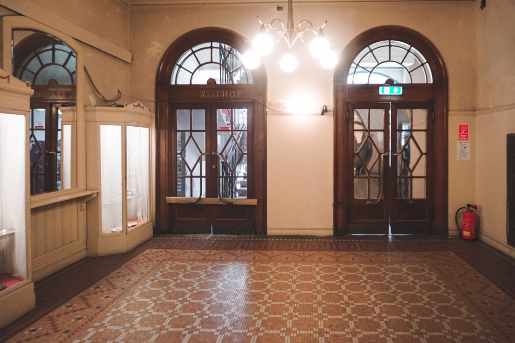 Das Hotel wird umgebaut werden. Wie viel von seiner ursprünglichen Identität erhalten bleiben wird, ist ungewiss. Bei dem Eigentümer besteht jedoch die Chance, dass es in guten Händen ist (zumindest hoffe ich das). Das absolut unvorstellbar wunderbare ist nämlich, dass noch unglaublich viel an originalem Mobiliar und Innenausstattung erhalten ist. Fliesen, Parkettböden, Möbel, es ist alles noch da. Und wenn man im Waldhofsaal steht, gewärmt von den Februarsonnenstrahlen, die durch die Panoramafenster fallen, die Augen über das weite Land schweifen lässt und den Erzählungen über all die Persönlichkeiten lauscht, die sich von der Magie dieses Ortes haben berauschen lassen, ist es fast, als könnte man den Nachhall der Walzerklänge und das Lachen der vielen tanzenden Gäste aus früheren Jahrhunderten noch erahnen wenn das Herz ein wenig schneller schlägt.